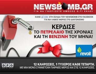 To NewsBomb.gr σε συνεργασία με τη Revoil προσφέρει στους αναγνώστες το πετρέλαιο της χρονιάς και τη βενζίνη του μήνα! Σε αυτή τη δύσκολη οικονομική συγκυρία και με τις τιμές του πετρελαίου και τις βενζίνης να ξεπερνούν κάθε προηγούμενο το NewsBomb.gr σε συνεργασία με τη Revoil εξασφάλισε για 12 τυχερούς επισκέπτες του το πετρέλαιο της χρονιάς και τη βενζίνη του μήνα!