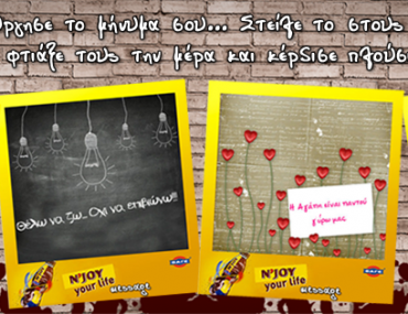 Δημιούργησε το δικό σου N’JOY YOUR LIFE MESSGAE, στείλε το στους φίλους σου και φτιάξε τους τη μέρα. Κάθε 2 εβδομάδες ένας νικητής θα κερδίζει ενα Sony Mp3 Player και στο τέλος, ο μεγάλος νικητής θα κερδίσει ένα sony playstation 3.