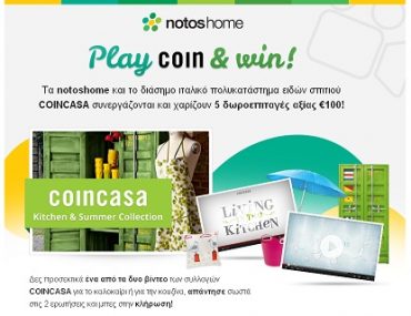Τα notoshome και το διάσημο ιταλικό πολυκατάστημα Coincasa σας καλούν να γνωρίσετε τις συλλογές καλοκαιρινών ειδών και ειδών κουζίνας και να πάρετε μέρος στο διαγωνισμό για μία από τις 5 δωροεπιταγές Coincasa αξίας 100 ευρώ.