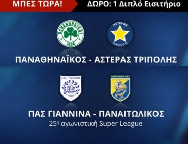 To Novasports.gr διοργανώνει διαγωνισμό και σας δίνει τη δυνατότητα να κερδίσετε ένα διπλό εισιτήριο για τον αγώνα ΠΑΣ Γιάννινα – Παναιτωλικός ένα για το Παναθηναϊκός – Αστέρας Τρίπολης!