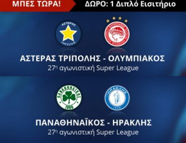 To Novasports.gr διοργανώνει διαγωνισμό και σας δίνει τη δυνατότητα να κερδίσετε ένα διπλό εισιτήριο για τον αγώνα Αστέρας Τρίπολης – Ολυμπιακός και ένα για τον Παναθηναϊκός – Ηρακλής!