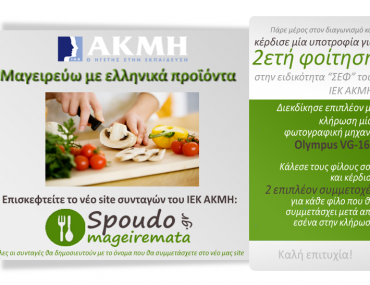 Το ΙΕΚ ΑΚΜΗ διοργανώνει διαγωνισμό και σας δίνει τη δυνατότητα να κερδίσετε μία υποτροφία για 2ετή φοίτηση στην ειδικότητα “ΣΕΦ” του ΙΕΚ ΑΚΜΗ ή μια φωτογραφική μηχανή Olympus VG-160.