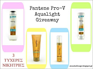 Το atouchofrouge.blogspot.gr διοργανώνει διαγωνισμό και σας δίνει τη δυνατότητα να κερδίσετε 3 ολοκληρωμένα σετ Aqualight από την Pantene Pro-V. To κάθε σετ περιλαμβάνει: Pantente Aqualight Σαμπουάν (Λεπτή τρίχα), Pantene Aqualight Conditioner (Λεπτή τρίχα), Ελαφριά μάσκα περιποίησης 2 λεπτών και Conditioner σε μορφή αφρού (Λεπτή τρίχα).