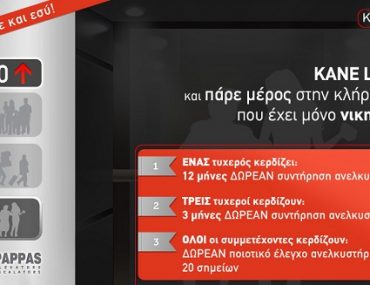 Η εταιρεία PAPPAS διοργανώνει μεγάλο φιαγωνισμό για ΔΩΡΕΑΝ συντήρηση ανελκυστήρα. 1 μεγάλος τυχερός κερδίζει 12 μήνες ΔΩΡΕΑΝ συντήρηση στον ανελκυστήρα του, 3 τυχεροί κερδίζουν από 3 μήνες ΔΩΡΕΑΝ συντήρηση στον ανελκυστήρα τους και ΟΛΟΙ οι διαγωνιζόμενοι κερδίζουν ΔΩΡΕΑΝ ποιοτικό έλεγχο στον ανελκυστήρα τους.