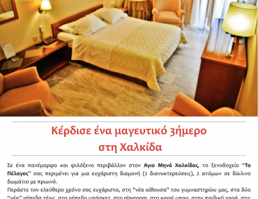 Το Ξενοδοχείο Το Πέλαγος διοργανώνει διαγωνισμό και σας δίνει τη δυνατότητα να κερδίσετε ένα 3ήμερο στο πανέμορφο περιβάλλον του ξενοδοχείου Το Πέλαγος στη Χαλκίδα, για 2 άτομα σε δίκλινο δωμάτιο με πρωινό, επιλέγοντας οποιοδήποτε 3ήμερο μέχρι τις 19 Δεκεμβρίου 2013.