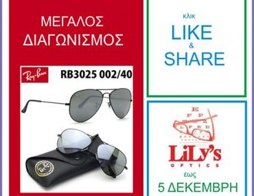 Το LILY’S OPTICS διοργανώνει διαγωνισμό και σας δίνει τη δυνατότητα να κερδίσετε ένα ζευγάρι γυαλιά ηλίου Ray Ban aviator αξίας 155.00 euro.
