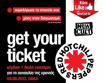 Η σελίδα NewCult Gr διοργανώνει διαγωνισμό και σας δίνει τη δυνατότητα να κερδίσετε 1 διπλό εισιτήριο για τη συναυλία των Red Hot Chili Peppers που θα γίνει 4 Σεπτεμβρίου στο Ο.Α.Κ.Α.