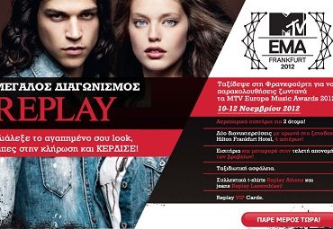 Η Replay διοργανώνει διαγωνισμό και σας δίνει τη δυνατότητα να κερδίσετε αεροπορικά εισιτήρια μετ’ επιστροφής για δύο άτομα από Αθήνα προς Φρανκφούρτη, διαμονή 2 ημερών σε δωμάτιο δύο ατόμων στο ξενοδοχείο Hilton της Φρανκγφούρτης και είσοδο για 2 άτομα στα MTV EMA 2012.