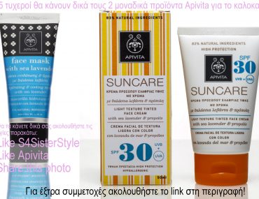 To S4SisterStyle σε συνεργασία με την Apivita χαρίζουν σε 5 τυχερούς από ένα σετ 2 καλοκαιρινών προϊόντων,1 αντηλιακό προσώπου με χρώμα SPF30 και μία μάσκα ενυδάτωσης και δροσιάς για το πρόσωπο με θαλάσσια λεβάντα!