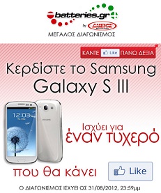 Η σελίδα Batteries.gr by Δήσιος διοργανώνει διαγωνισμό και σας δίνει τη δυνατότητα να κερδίσετε ένα Samsung Galaxy SIII.