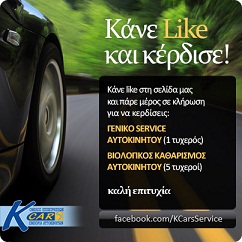 Η KCars Service διοργανώνει διαγωνισμό και σας δίνει τη δυνατότητα να κερδίσετε ένα γενικό service αυτοκινήτου, που περιλαμβάνει αλλαγή λαδιών, αλλαγή φίλτρου λαδιού, αλλαγή φίλτρου καυσίμου, αλλαγή φίλτρου καμπίνας, αλλαγή φίλτρου αέρος και έλεγχο βαλβολίνης, φρένων, εμπρόσθιου συστήματος, A/C, καυσαερίων, διαρροών, φώτων, υγρών, ελαστικών και 5 βιολογικούς καθαρισμούς σε όλο το εσωτερικό του αυτοκινήτου.
