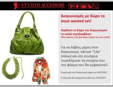 Το Studio Accessori διοργανώνει διαγωνισμό και σας δίνει τη δυνατότητα να κερδίσετε το most wanted set (περιλαμβάνει μία τσάντα, ένα φουλάρι-παρεό και ένα κολιέ), συνολικής αξίας 58,00 €.