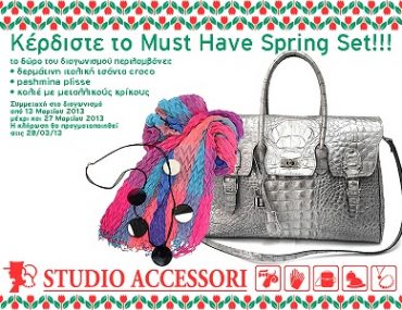 Η σελίδα Studio Accessori διοργανώνει διαγωνισμό και σας δίνει τη δυνατότητα να κερδίσετε ένα «Must Have Spring Set» (περιλαμβάνει μία δερμάτινη ιταλική τσάντα croco, μία pashmina plisse, ένα κολιέ με μεταλλικούς κρίκους), συνολικής αξίας 200,00 €.
