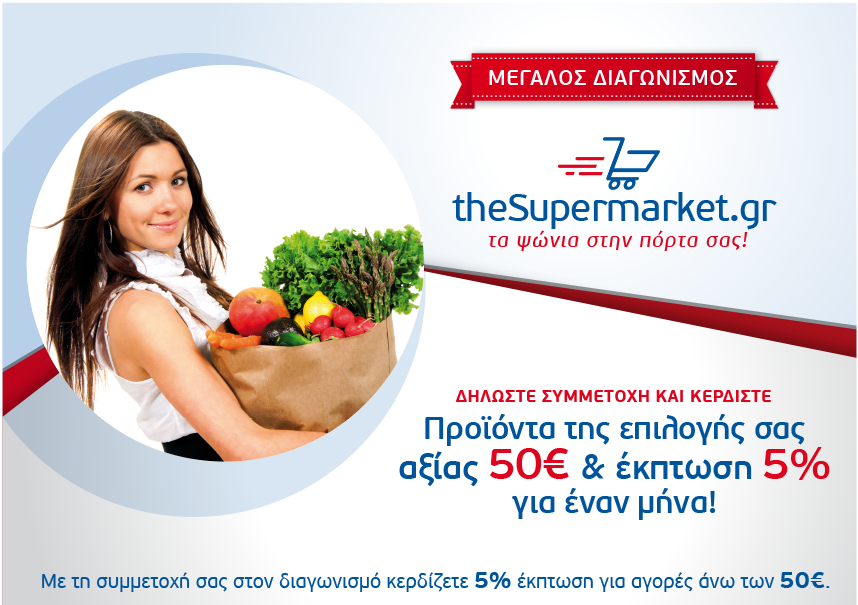 To thesupermarket.gr διοργανώνει διαγωνισμό και σας δίνει τη δυνατότητα να κερδίσετε προϊόντα της επιλογής σας, αξίας 50€ και έκπτωση 5% για ένα μήνα!