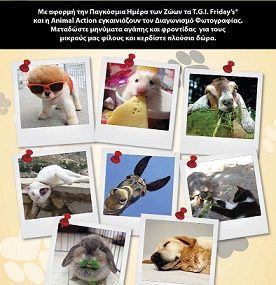 Τα T.G.I. Friday’s διοργανώνουν διαγωνισμό και δίνουν τη δυνατότητα στους πρώτους 3 νικητές που θα προκύψουν από 3μελή κριτική επιτροπή από τα T.G.I. Friday’s και την Animal Action, να κερδίσουν: μια DIGITAL CAMERA SAMSUNG EC-PL120Z, ένα SONY WALKMAN MP4 και ένα SONY WALKMAN NWZB173F (4 GB). 30 ακόμα τυχεροί θα κερδίσουν μετά από κλήρωση: 10 γεύματα των 2 ατόμων στα T.G.I. Friday’s (αξίας 40€ το καθένα), 10 δωροεπιταγές cocktail για 2 άτομα στα T.G.I. Friday’s (αξίας 13,90€ το καθένα) και 10 βιβλία «Περί Ζώων, με λογική και συναίσθημα» των εκδόσεων Ψυχογιός.