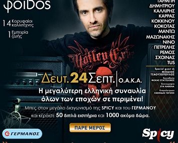 Η Spicy και ο Γερμανός διοργανώνουν διαγωνισμό και σας δίνουν τη δυνατότητα να κερδίσετε 50 διπλά εισιτήρια για τη συναυλία για τα 20 χρόνια του Φοίβου στο ΟΑΚΑ στις 24 Σεπτεμβρίου και 1000 ακόμα δώρα από το Γερμανό, tablet SAMSUNG GALAXY TAB II, smartphones SAMSUNG GALAXY ACE 2, προπληρωμένες κάρτες (prepaid cards), usb sticks 4GB, mouse υπολογιστή, σετ Web communication, mouse pads και εξωτερικούς σκληρούς 500Gb.