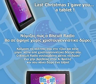 Νόμιζες πως ο Biscuit Radio θα σε άφηνε χωρίς χριστουγεννιάτικο δώρο; Κρέμασε τις κάλτσες σου στο τζάκι και κάνε χώρο κάτω από χριστουγεννιάτικο δέντρο σου. Ο Biscuit αναλαμβάνει φέτος να δώσει ένα χέρι βοηθείας στον Άι Βασίλη και σου κάνει δώρο ένα tablet Android 4.0 Ice Cream Sandwich με οθόνη 7”, 1.0Ghz επεξεργαστή και χωρητικότητα 4GB!