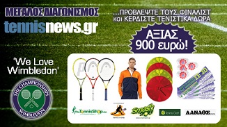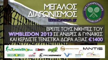 Το tennisnews.gr διοργανώνει διαγωνισμό και σας δίνει τη δυνατότητα να κερδίσετε 26 μοναδικά τενιστικά δώρα αξίας 1400 ευρώ! Βρείτε τους Νικητές τουWimbledon 2013 και μπείτε στην κλήρωση για να είστε εσείς ένας από τους 26 τυχερούς!