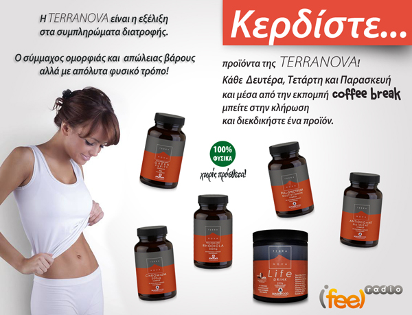 Το ifeelradio.gr διοργανώνει διαγωνισμό και σας δίνει τη δυνατότητα να κερδίσετε προϊόντα ομορφιάς – αδυνατίσματος από την TERRANOVA μέσα από την εκπομπή coffee break στο ifeelradio 12.00 με 14.00 κάθε Δευτέρα –Τετάρτη – Παρασκευή!