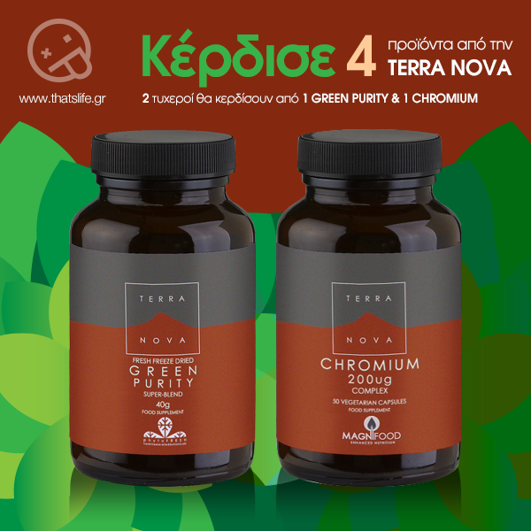 To thatslife.gr διοργανώνει διαγωνισμό και σας δίνει τη δυνατότητα να κερδίσετε 4 σετ (από δύο) συμπληρώματα διατροφής Terranova Chromium Complex & το Green Purity! Δυο ξεχωριστά προϊόντα για τη δίαιτα και την αποτοξίνωση.