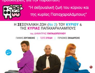 Η σελίδα The CowArts διοργανώνει διαγωνισμό και σας δίνει τη δυνατότητα να κερδίσετε αυτή την Παρασκευή 5 διπλές προσκλήσεις για τη «Σεξουαλική ζωή του κυρίου και της κυρίας Παπαχαραλάμπους».