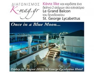 Το online μαγκαζίνο The K-magazine και το ξενοδοχείο St. George Lycabettus διοργανώνει διαγωνισμό και σας δίνει τη δυνατότητα να κερδίσετε ένα γκουρμέ δείπνο 5 πιάτων (με κρασί) , για 2 άτομα στο εστιατόριο Le Grand Balcon για την Παρασκευή 31 Αυγούστου, με αφορμή την μπλε πανσέληνο.