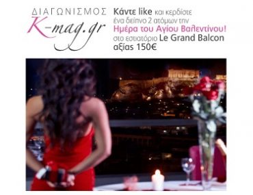 Το online μαγκαζίνο The K-magazine και το ξενοδοχείο St. George Lycabettus διοργανώνει διαγωνισμό και σας δίνει τη δυνατότητα να κερδίσετε ένα ρομαντικό γκουρμέ δείπνο αξίας 150 ευρώ, για 2 άτομα στο εστιατόριο Le Grand Balcon για την Πέμπτη 14 Φεβρουαρίου 2013, για την Ημέρα του Αγίου Βαλεντίνου!