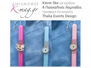 Το online μαγκαζίνο The K-magazine και η εταιρεία Thalia Events Design διοργανώνουν διαγωνισμό και σας δίνουν τη δυνατότητα να κερδίσετε 4 Πασχαλινές λαμπάδες.