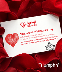Η Triumph σας προσκαλεί να παίξτε στο Triumph Ρομάντζο Generator και να μπείτε στην κλήρωση για ένα Valentine’s Day σούπερ δώρο. Μια διανυκτέρευση με δείπνο σε πολυτελές ξενοδοχείο της Αθήνας για τις 14 Φεβρουαρίου 2012 για δύο άτομα και ένα set Triumph.