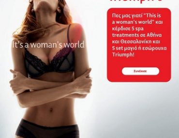 Η σελίδα Triumph στο facebook διοργανώνει διαγωνισμό και σας δίνει τη δυνατότητα να κερδίσετε 5 spa treatments σε Αθήνα ή Θεσσαλονίκη (σε μορφή δωροεπιταγής με εξάμηνη διάρκεια εξαργύρωσης) και 5 σετ μαγιό ή εσώρουχα Triumph.
