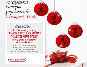 Το Vari Sports Club διοργανώνει διαγωνισμό και δίνει τη δυνατότητα σε 8 τυχερούς να κερδίσουν 2 (δυο) εξάμηνες συνδρομές, 2 (δυο) ωριαία Personal Training, 2 (δυο) test μεταβολισμού και 2 (δυο) 40’ μυοχαλαρωτικά μασάζ.
