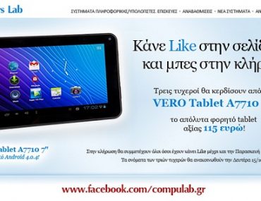 Η σελίδα Computers Lab διοργανώνει διαγωνισμό και σας δίνει τη δυνατότητα να κερδίσετε 3 VERO Tablet A7710 7″, το απόλυτα φορητό tablet, αξίας 115 ευρώ.