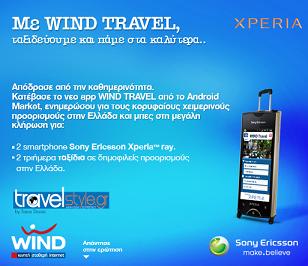Η Sony Ericsson σας προσκαλεί να συμμετάσχετε στο διαγωνισμό «Με WIND TRAVEL,ταξιδεύουμε και πάμε στα καλύτερα..» και δίνει τη δυνατότητα σε δύο (2) νικητές να κερδίσουν από μια συσκευή Xperia ray και στους επόμενους δύο (2) νικητές να κερδίσουν από μία επταήμερη διαμονή (συμπεριλαμβανομένης ημιδιατροφής) σε ένα από τα εξής ξενοδοχεία Filoxenia Hotel & Spa στα Καλάβρυτα, Xenia Palace Portarias στη Πορταριά και Limneon Resort & Spa στην Καστορια, για 2 άτομα.