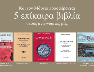 Η «Zeronews» στηρίζοντας τον πολιτισμό και δη τον έντυπο λόγο, προσφέρει κάθε μήνα πέντε αξιόλογα βιβλία. Για τον μήνα Μάρτιο οι αναγνώστες μας μπορούν να διεκδικήσουν τα εξής βιβλία: «Η ΙΚΑΝΟΤΗΤΑ ΤΗΣ ΔΙΑΚΥΒΕΡΝΗΣΗΣ» ΤΟΥ ΥΕHEZKEL DROR, «ΦΙΛΕΛΛΗΝΙΚΑ» ΤΟΥ Ι.ΔΗΜΑΚΗ, «ΟΜΗΡΟΣ» ΤΩΝ A.WACE – FR.STUBBINGS, «ΔΗΜΟΣΘΕΝΟΥΣ ΛΟΓΟΙ» ΤΟΥ ΧΡ. ΞΥΔΑ και «ΜΙΚΡΑ ΑΣΙΑ –ΜΝΗΜΕΣ ΕΛΛΗΝΩΝ».