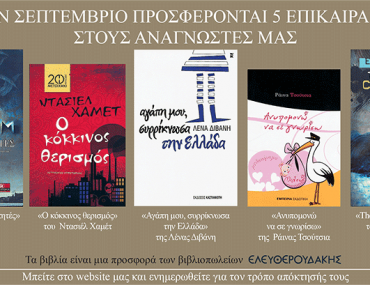 Η «Zeronews» στηρίζοντας τον πολιτισμό και δη τον έντυπο λόγο, προσφέρει κάθε μήνα πέντε αξιόλογα βιβλία. Για τον μήνα Σεπτέμβριο οι αναγνώστες μπορούν να διεκδικήσουν τα εξής βιβλία, τα οποία είναι μια προσφορά των βιβλιοπωλείων «ΕΛΕΥΘΕΡΟΥΔΑΚΗΣ».