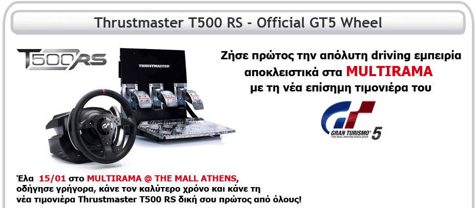 Η Zegetron και το δίκτυο καταστημάτων MULTIRAMA είναι στην ευχάριστη θέση να ανακοινώσουν την πρώτη παρουσίαση του επίσημου τιμονιού GT5 της Thrustmaster Τ500 RS στην Ελλάδα το Σάββατο 15 Ιανουαρίου στο The Mall Athens! Στο χώρο του καταστήματος θα διεξαχθεί διαγωνισμός, και ο νικητής θα κερδίσει το απόλυτο όπλο οδήγησης: το Thrustmaster T500 RS!